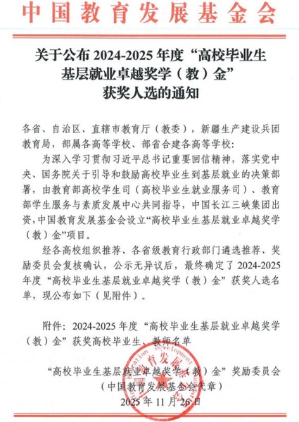 【喜报】我校毕业生荣获2024-2025年度“全国高校毕业生基层就业卓越奖学金”