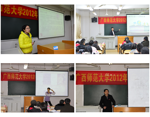 为了鼓励青年教师在课堂教学中大胆探索、勇于创新,更加重视课堂教学基本功的训练,促进我校青年教师队伍建设和课堂教学质量的提高,校工会联合教务处、人事处、宣传部、学工部(处)、青年教师成长学校等单位于12月26日下午在育才校区第二理科综合楼707和708两个教室分别举行了2012年广西师范大学青年教师说课比赛决赛。学校副校长、教学指导委员会副主任钟瑞添教授,江佑霖教授等十位教学指导委员会委员分别担任文、理科组的评委,校工会负责人、各学院工会主席、青年教师、学生到场观摩。