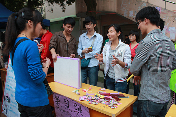 在育才校区东苑食堂前, 一场有奖知识问答吸引了不少同学的参与,"女生节的由来"、"女生节内容"等相关问题难倒了不少同学,工作人员耐心地向大家介绍着。还有不少女生参与起了现场的呼啦圈大赛、"袋鼠跳"比赛、折纸比赛等游园活动,场面热闹非凡。