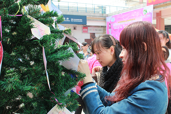 女生们在许愿树上系上自己的心愿(大学生通讯社 邹添龙 摄)