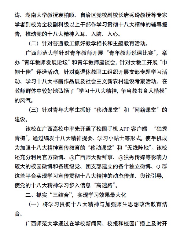 日前,在中共广西壮族自治区高等学校工作委员会、广西壮族自治区教育厅办公室编发的《广西教育工作简报》上,刊发了《广西师范大学注重“三针对”加强“三结合”将学习十八大精神引向深入》为题的经验介绍,向全校各高校推介我校学习十八大精神的经验做法。