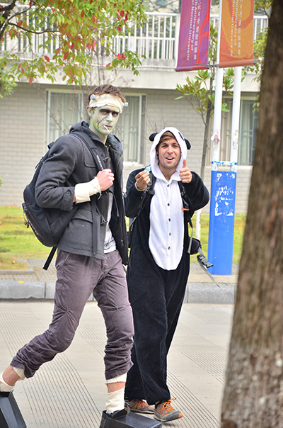 早上十点左右,就有雁山校区的学生们看到美国外教James、Carter以及Caleb分别打扮成僵尸、可爱的熊猫和搞怪的猎人出现在孔子广场和文二区教学楼,吸引了众多学生的目光。两名帅哥外教也很热情地接受大家提出合照的邀请。Carter表示,他从小到大最喜爱的节日就是Halloween; Caleb不改搞笑本色,给大家带来欢乐。高大帅气的James则提前就邀请了2012级中英英语2班的同学们再班内举行party,中英英语2班的同学们都积极参与、大家互相帮忙化妆、准备奇异服装出席“万圣派对”。其中,有装扮成“白发魔女”、“女巫”的,更有化妆成“吸血鬼”的同学,现场气氛一片狂热。