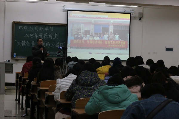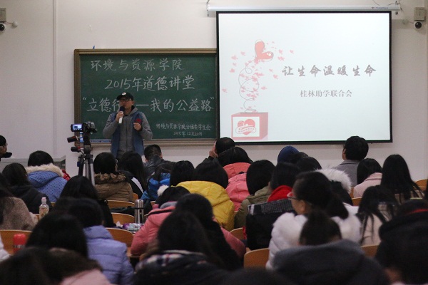 立德立志乃是立人之本,学善行善而后堪以大用。近日,环境与资源学院师生于雁山校区理二区201教室开展主题为“立德行善:我的公益路”的道德讲堂活动,弘扬和践行社会主义核心价值观。本次活动邀请了我校漓江学院派驻资源县咸水口村的第一书记张常永老师讲述他在咸水口村建设美丽乡村的故事,同时还邀请了参与咸水口村等多地捐资助学公益活动的桂林助学联合会常务理事、副秘书长林子(李鹏鸣)先生讲述桂林助学联合会及其个人的公益之路。