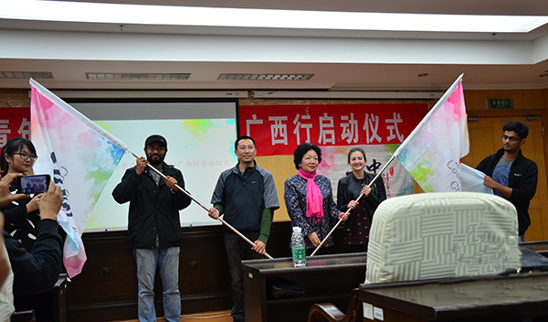 外方学生代表 Lian Morrison与我校的学生志愿者代表蒋婧林也相继在启动仪式上发言,希望影像计划活动能够圆满成功。随后,王枬女士、罗军先生共同为学生代表授旗,正式启动2016“看中国•外国青年影像计划•广西行”项目。