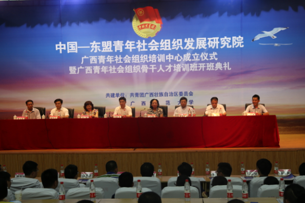 7月10日上午,由广西团区委和广西师范大学联合共建的中国--东盟青年社会组织发展研究院及广西青年社会组织培训中心在我校正式成立。广西团区委书记白松涛、我校党委书记王枬、大益爱心基金会汪敏秘书长、中国国际民间组织合作促进会黄浩明副理事长、共青团广西区委廖长友副书记等领导出席仪式并揭牌。广西团区委、广西民政厅、桂林市民政局、广西12个地市共青团组织代表、74所高校社团代表及青年社会组织等300多人参加了仪式。仪式由我校党委副书记赵铁主持。