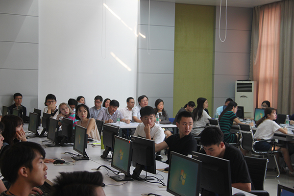 在雁山校区文二区103教室,校党委副书记赵铁一行与国际文化教育学院2015级中美英语专业的同学一同听取了外教Laura的《商务英语初级》课程。课堂上,师生初见,气氛融洽,学生们自制名牌,方便老师认识同学。随后,Laura提议同学们向她提问一个自己感兴趣的问题,一问一答中,课堂气氛越来越热烈。Laura当即抛出一个问题:What is business?引发了同学们更为热烈的讨论,大家纷纷上讲台在黑板上写下自己的看法,她又列举了几种情况让同学们判断是否是商业行为,这样循序渐进地,把同学们引入到了商务英语的学习当中。