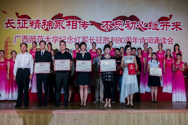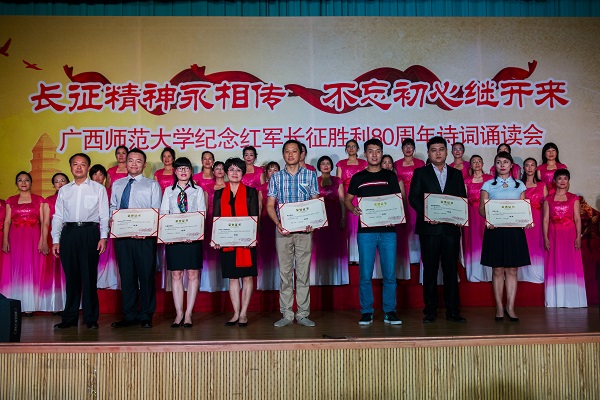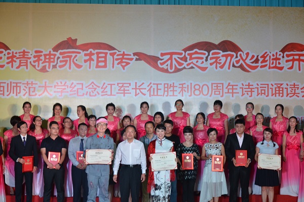 《长征精神永相传·不忘初心继开来》诗词诵读会是我校响应党中央号召,纪念红军长征胜利80周年系列活动中的一项重要内容,由校工会、宣传部、校团委牵头,各参赛代表队倾力打造,演职人员总数近200人,其中年龄最大的68岁,最小的仅6岁,既有在职教职工,又有退休老干部;既有分布于16个国家的留学生,又有来自卓然小学的小学生,整场晚会打破了以往诗词朗诵的常用套路,运用戏剧化表现手法,使朗诵和配乐、舞蹈、演唱、情景剧融为一体,高潮不断、扣人心弦,构成了革命精神薪火相传、共同讴歌人间奇迹的动人场景。