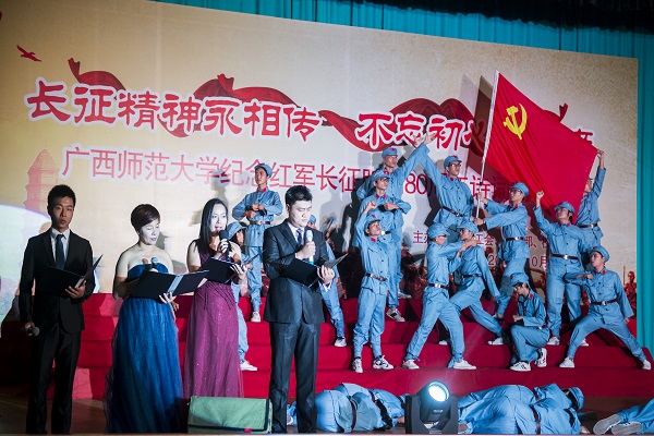 深情吟诵,回望艰苦卓绝岁月;歌声豪迈,颂扬伟大长征精神。10月28日晚,我校纪念红军长征胜利80周年诗词诵读会《长征精神永相传·不忘初心继开来》在育才校区田家炳教育书院报告厅隆重举行,校党委副书记赵铁出席了本次诵读会,参加诵读会的还有各基层党委、党总支负责人,各机关部门负责人,各分工会主席,兴安县县委宣传部副部长李春荣以及300余名师生代表。