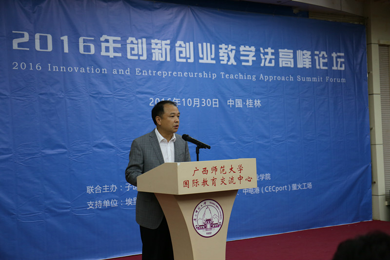 为提高我校创新创业、教学法的基础师资力量,拓宽青年教师的创新创业思维,由我校创新创业学院联合子谦国际创业教育学院(以下简称子谦国际)主办的“2016年创新创业教学法高峰论坛暨中国大学创业基础师资培训”,于10月30日~11月2日在我校育才校区国际教育交流中心成功举办。校党委副书记赵铁出席并致词,出席论坛的还有校教务处、学工部(处)、校团委、教师教学发展中心、校友总会等相关部门的负责人。此外,来自武汉理工大学、北京城市学院、贵州商学院、广西医科大学等区内外10多所高校及我校共近百名教师,参加本次论坛及培训。