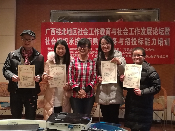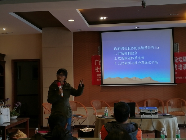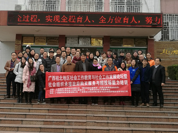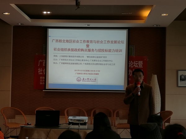 为更好地促进学校人才培养与社会需求的精准对接,服务社会组织更好地承接政府购买服务,法管学院创新教研室活动形式,于1月14日在育才校区举办了“广西桂北地区社会工作教育和社会工作发展论坛暨社会组织承接政府购买服务于招投标能力培训”。活动由社会工作硕士教育中心、广西厚生社会工作服务中心主办,由广西健坤科技发展有限公司、法学院/政治与公共管理学院社会学与社工系协办,得到了上海踏瑞计算机软件有限公司 、“孵化桂林公益项目”的支持。 广西师范大学社会工作专业教研室、社会保障教研室、社会学教研室全体老师以及来自南宁市、桂林市、河池市、崇左市的社会组织代表和广西科技大学、兰州城市学院等9位相关专业老师等约60人参加了此次活动。