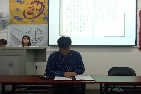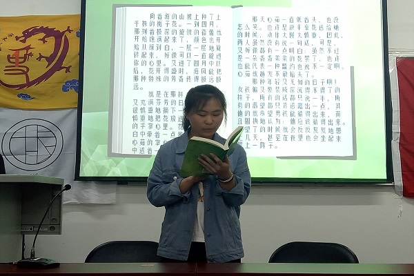 在舒缓的音乐伴奏下,朗读者们带着他们最喜爱的书籍,为在座的听众奉献了一场最震撼人心的朗诵,有《天下西湖》的悠扬轻柔,也有《告全国同胞书》的铿锵激愤,还有时而婉转又时而青涩似纯洁的《栀子》,不同的风格下,却有着同一颗热爱阅读热爱文字的赤忱之心!一首毕,另首起,余音绕梁,久久不散。现场的听众们则以热烈的掌声向朗诵者们寄以心中高度的赞美与钦佩之情。