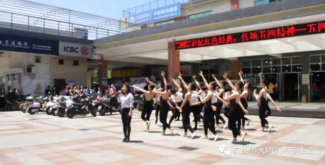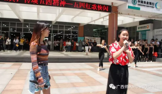 “总想对你表白,我的心情是多么豪迈,总想对你倾诉,我对生活是多么热爱……”5月4日中午11时50分许,音乐学院组织了一场“追忆红色经典,传颂五四精神”红歌快闪活动,由从人群中“突然冒出”的管乐领奏《红旗颂》到“歌王之夜”的获奖歌手独唱《红旗飘飘》、以及《唱支山歌给党听》、《走进新时代》等耳熟能详的经典红歌,50余名演职人员及一边挥舞着红旗,一边伴唱着从四面八方围聚拢来,并吸引着更多过往的人们情不自禁地加入其中,共同合唱,以此形式共庆五四青年节。