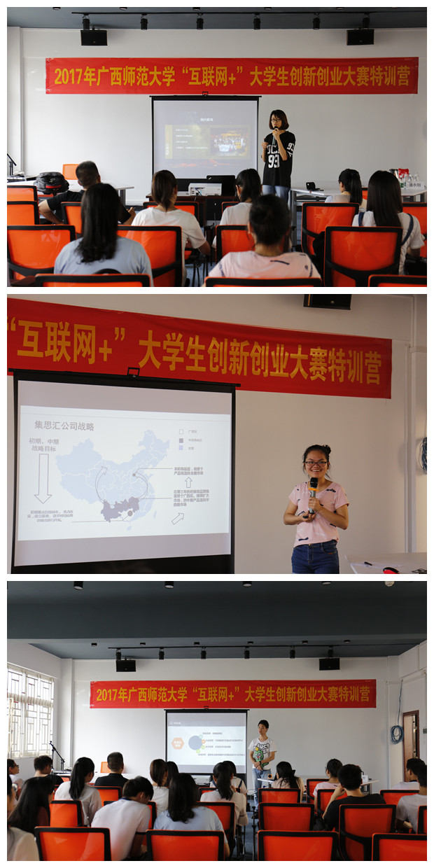 为了我校更好地备战第三届中国“互联网+”大学生创新创业大赛,进一步提升各参赛项目撰写商业计划书、PPT 路演、视频制作等方面的能力。近日,创新创业学院联合教务处共同举办了“2017年广西师范大学互联网+大学生创新创业大赛特训营”。参加培训的学员来自“2017年广西师范大学互联网+大学生创新创业大赛”前40名的项目负责人及成员。