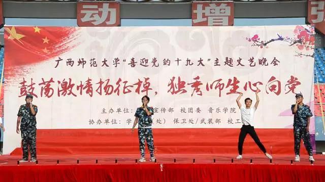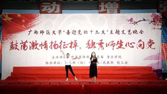 本次活动伴舞由2017级舞蹈学专业 覃慧妮 吴富荣 刘承钊 莫浩铭 魏淑儿 李琛源 夏姝婧 邱应乐 陈科燃 徐建国 冯奕玮 钟 浪 杨 奇 孙 行 温丽娜 王稚雅 胡天伟 , 舞蹈指导老师:张敏 许静如 钱康 邱思琦。