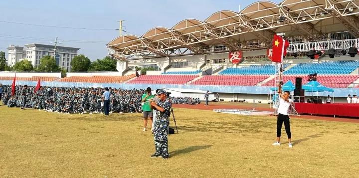 29日下午4时许,参加军训阅兵和总结表彰大会的学子们已走进体育场集合。此时,田径场草坪中央,一把小号吹出了振奋人心的号角,正当来往行人纷纷疑惑的时候,一排青年学子高举国旗迅速进入人群,与此同时,又有另外一群学生,在舞台上开始唱歌、跳舞。高亢的乐曲、嘹亮的歌声,充满张力的舞蹈迅速引得学生们围观。