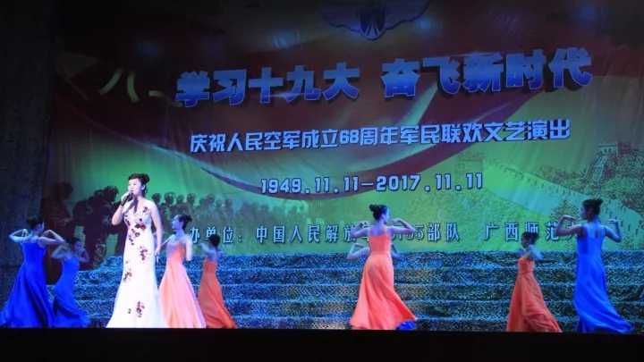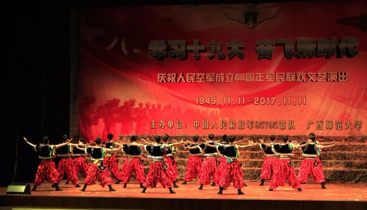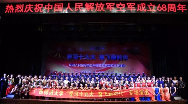 广西师范大学音乐学院师生和95795部队官兵一起,给大家献上了精彩的节目,表达对官兵的慰问,热烈庆祝人民空军成立68周年,宣传党的十九大精神。