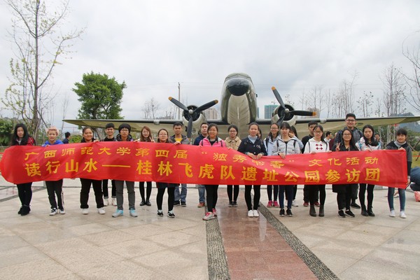 当天上午,数十名师生乘车来到位于临桂区的飞虎队遗址公园,在公园解说员的带领下,首先认真地参观了公园展馆。在展馆大厅的汉白玉群体塑像前,大家表情肃穆,伫立凝视,对中美空军将士的浴血奋战以示敬意。随后,同学们依次参观“历史的天空”、“虎啸云端”、“飞虎在桂林”、“永不磨灭的番号”等四个主题展。展馆中陈列着美国飞虎队历史委员会捐赠的近300件历史文物。至今仍闪闪发光的飞虎队勋章、微微泛黄的照片资料、飞虎队队员专用的军大衣、地图……在这些历史文物中,满满的都是历史的记忆。据介绍,这些历史文物都是原来的飞虎队队员们从飞虎队家属、收藏爱好者及拍卖市场上收集回来的,有的是珍贵的纪念品,有的是飞虎队队员们当年的用具。其中最被飞虎队队员们看重的是一小块裁成方形的布片,上面绣着“美国空军,来华助战,仰我军民,一体救护”16个字,飞虎队队员们把它称为护身符。它一般被缝在飞虎队队员的胸前或背后,如果他们驾驶战机在战斗中被击中坠落地面,遇到当地中国老百姓,把布片亮出来,就能得到救助。这小小的布片,既是飞虎队队员的护身符,也是中美军民在血火中凝结的友谊的象征!同学们一边认真听讲解,一边仔细观看这些文物,默读旁边的文字介绍,常常沉浸历史之中,流连忘返。