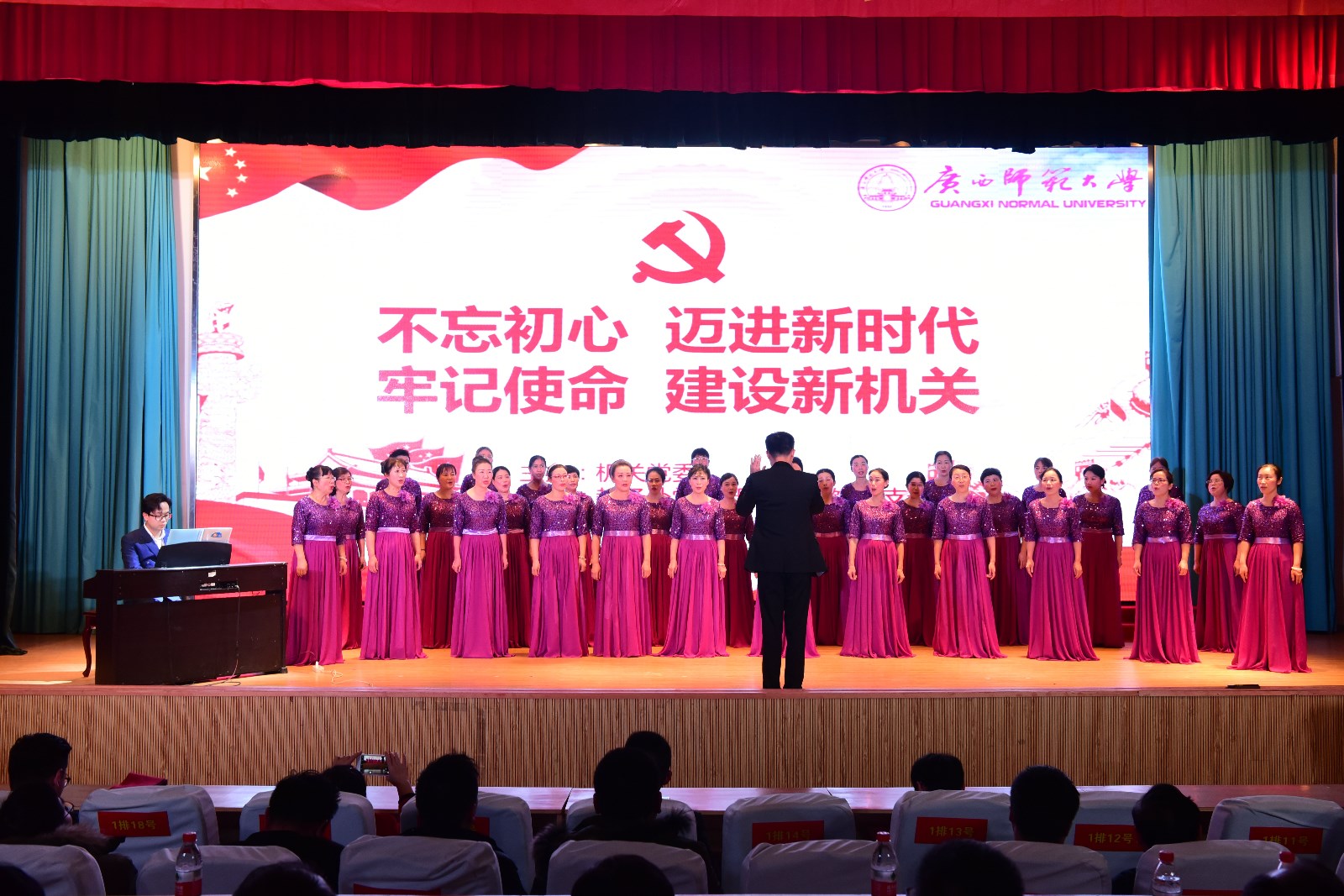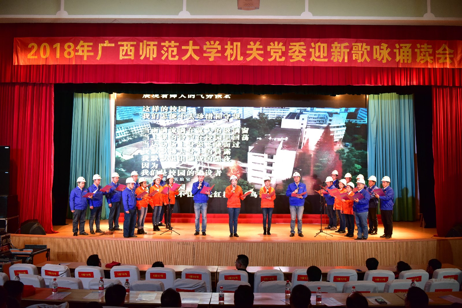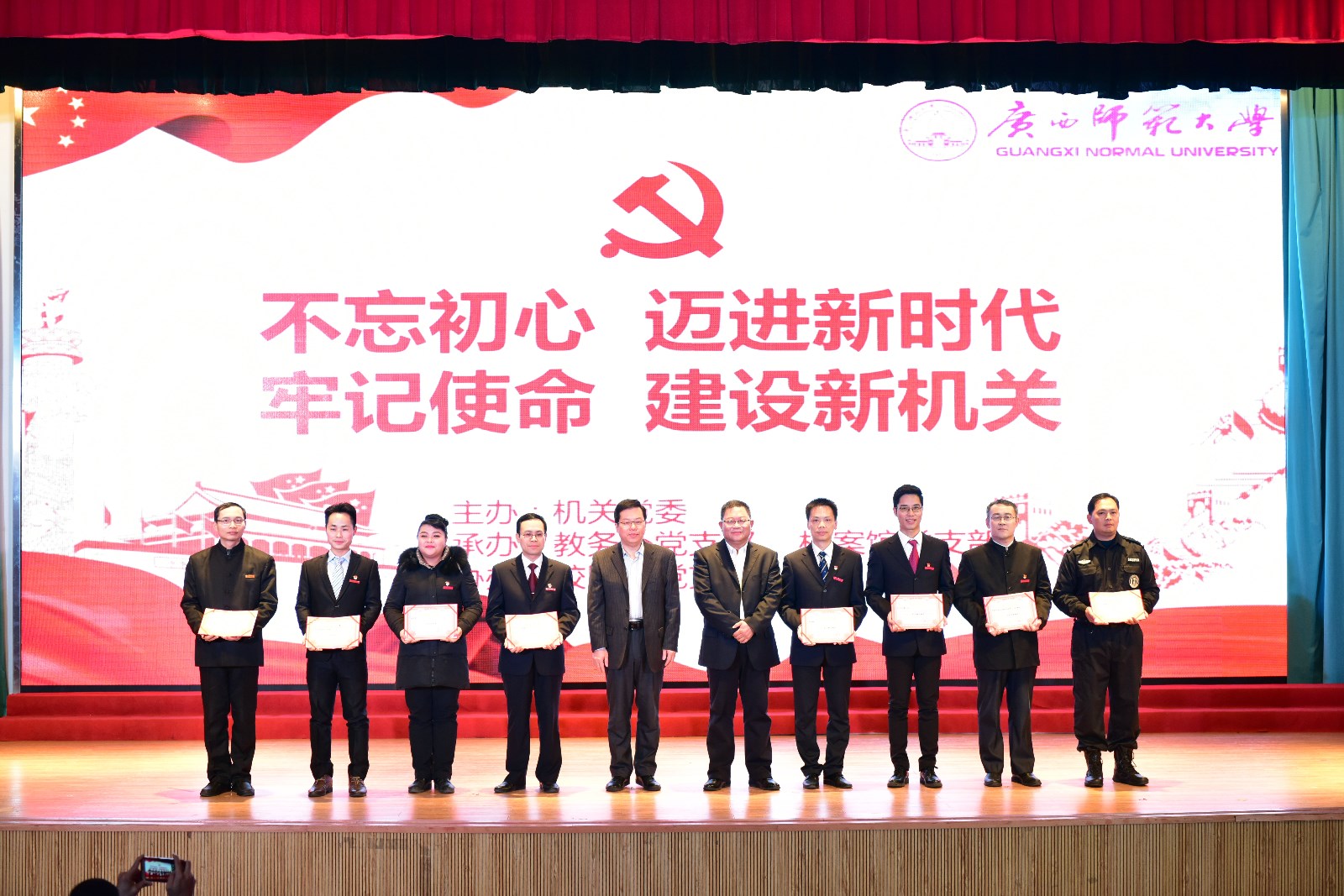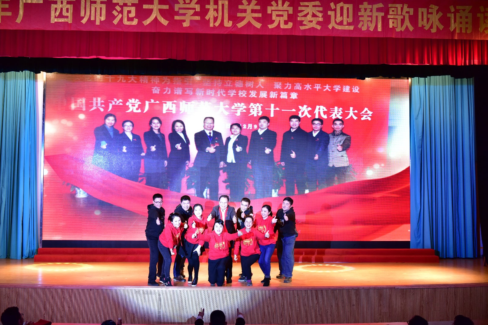 本场晚会也得到学校领导的高度重视,晚会开始前,机关党委负责人宣读了《关于表彰2017年机关党委“争当八桂先锋、争做合格党员”活动先进集体和先进个人的决定》,随后由校党委邓军书记、贺祖斌校长对获得表彰的集体和个人进行颁奖。在家10位校领导在邓军书记、贺祖斌校长的带领下亲自上台与校办、党办支部全体职工一起豪情万丈演唱了革命歌曲《我们走在大路上》,给整台晚会开了好头,随后18个节目依次登场,以最饱满的精神演绎了机关人的精彩。