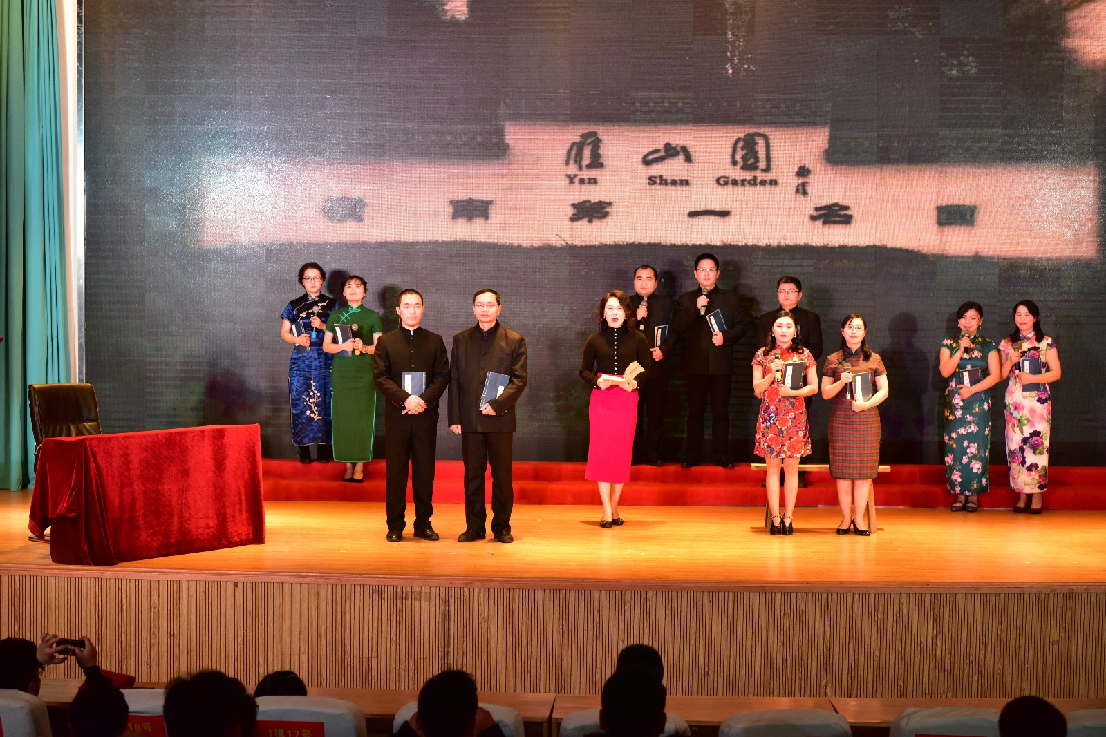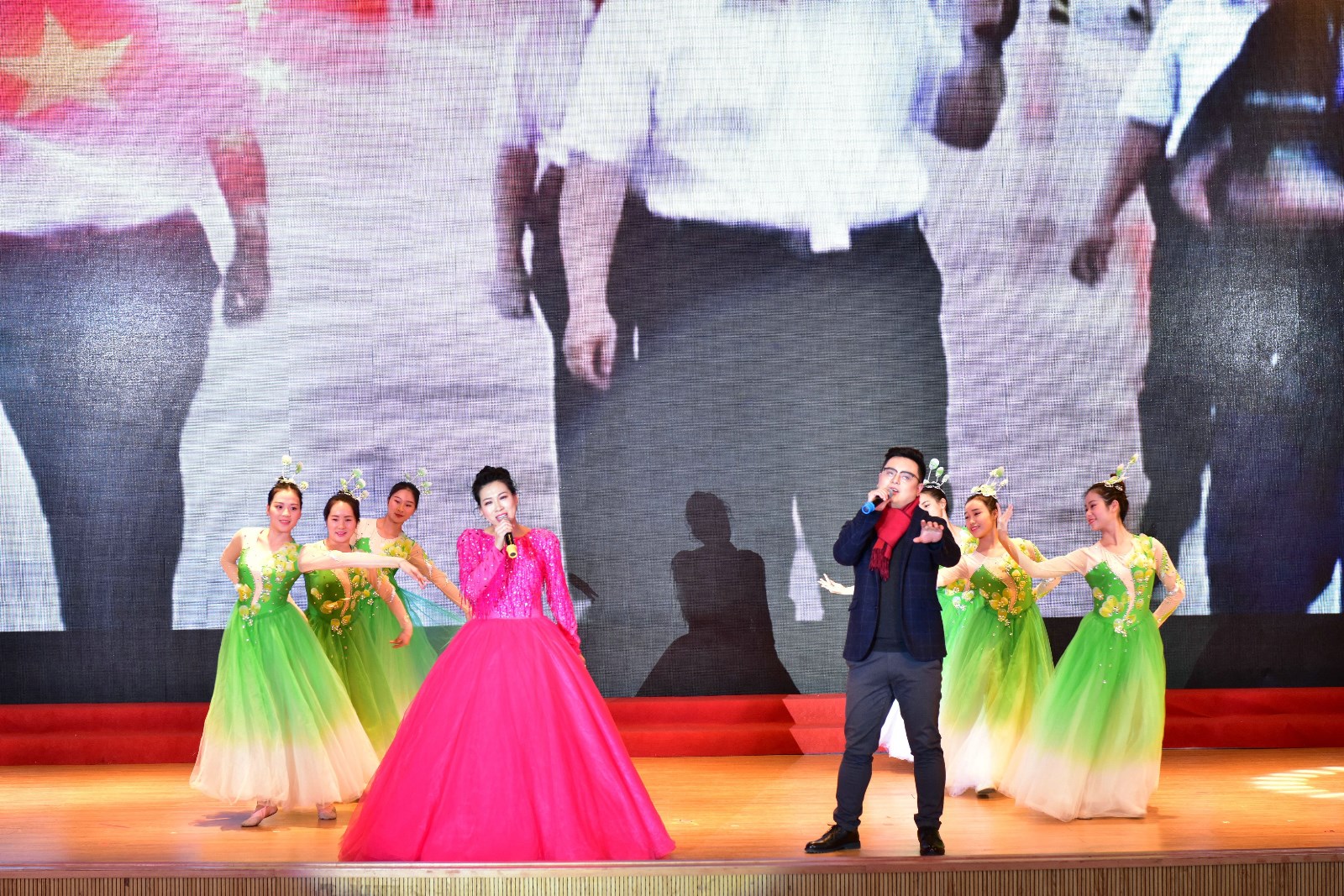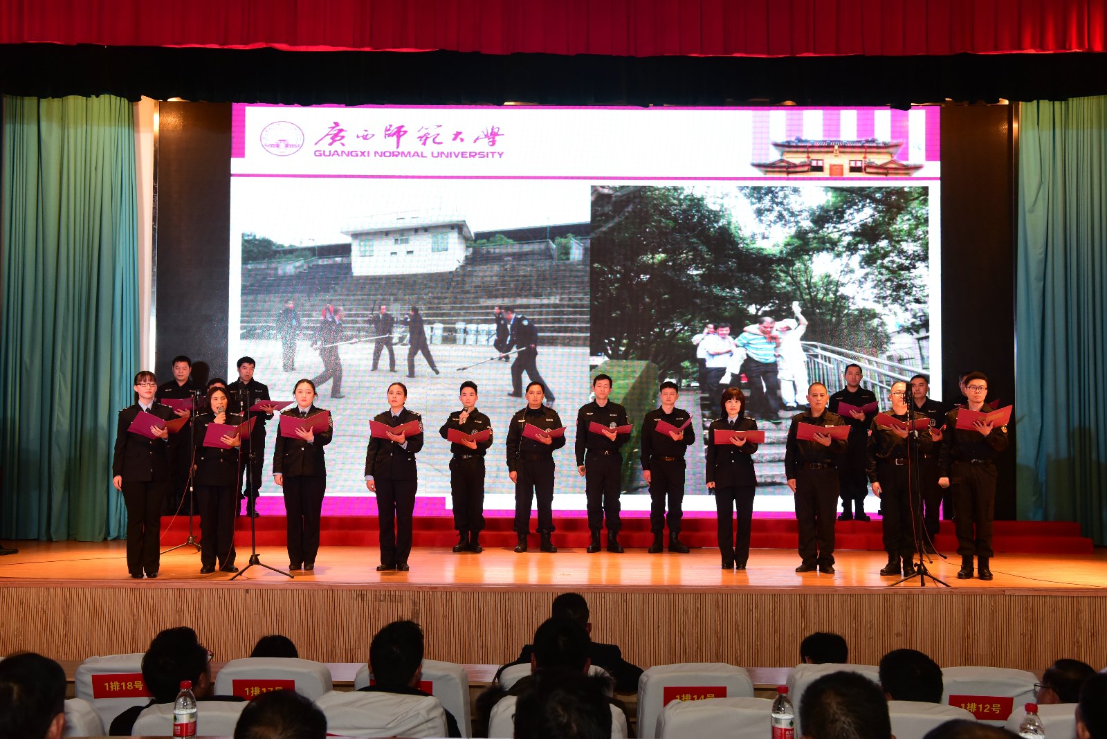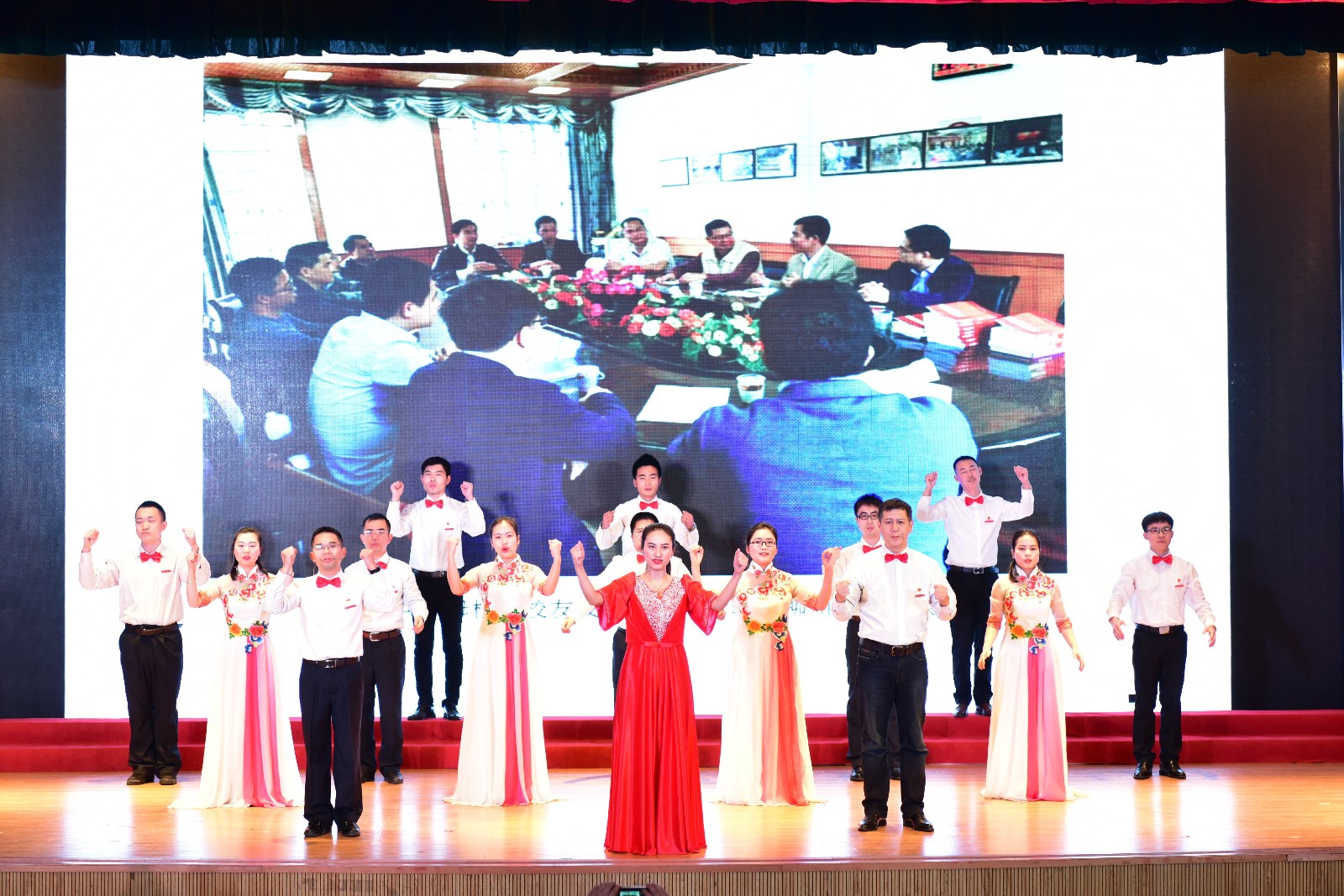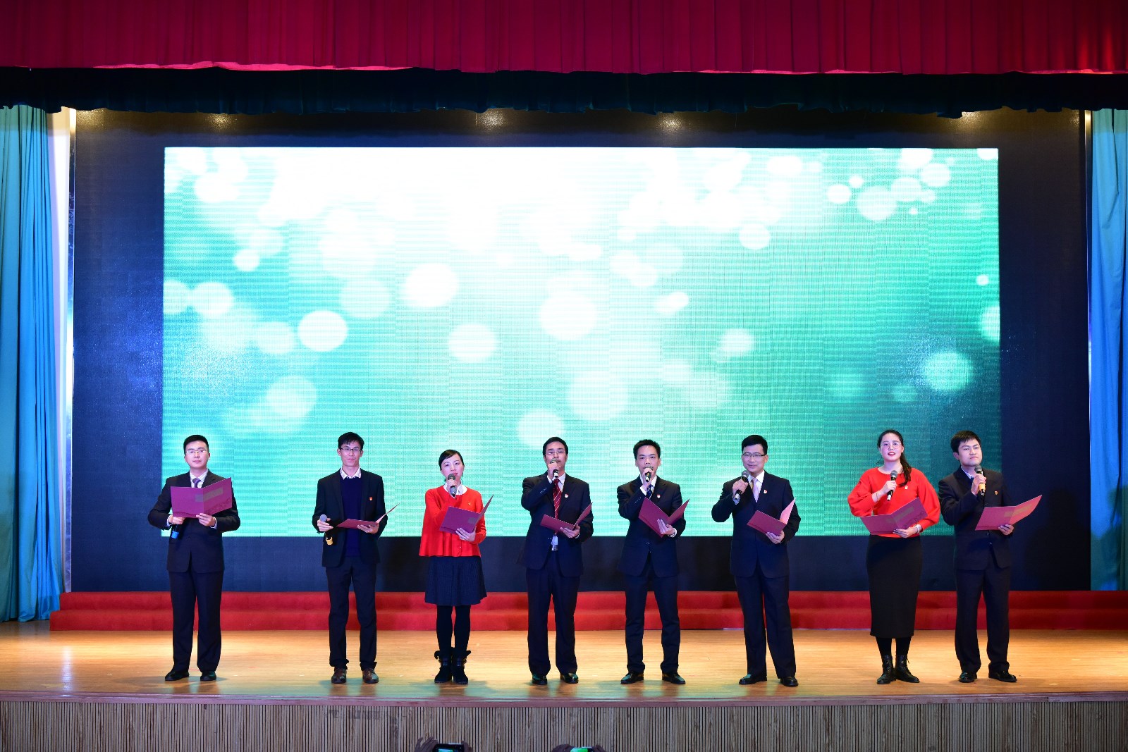 本场晚会也得到学校领导的高度重视,晚会开始前,机关党委负责人宣读了《关于表彰2017年机关党委“争当八桂先锋、争做合格党员”活动先进集体和先进个人的决定》,随后由校党委邓军书记、贺祖斌校长对获得表彰的集体和个人进行颁奖。在家10位校领导在邓军书记、贺祖斌校长的带领下亲自上台与校办、党办支部全体职工一起豪情万丈演唱了革命歌曲《我们走在大路上》,给整台晚会开了好头,随后18个节目依次登场,以最饱满的精神演绎了机关人的精彩。