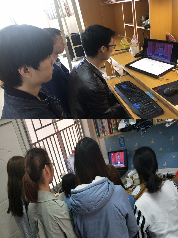 研究生思政专业党支部组织支部成员以“个人+小组+集体”的方式,在教室、宿舍收看十三届全国人民代表大会第一次会议开幕式。研究生综合团支部联合思政团支部组织2017级全体研究生到文科楼一区407教室观看了此次开幕式的视频直播。本科生政教专业党支部的党员们纷纷围坐在一起,凝神聆听李克强总理所作的政府工作报告。2017级思想政治教育第一、第二团支部全体成员准时在雁山校区理科楼一区212教室一同收看开幕会盛况。学院分团委在会议室组织团学干部举行学习座谈会。马院各党团支部关注时政,掀起学习两会精神热潮。