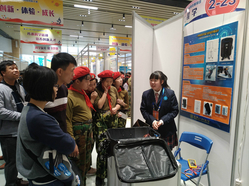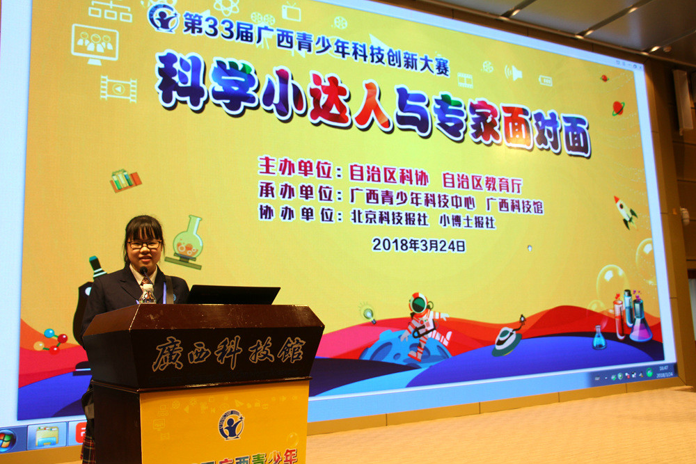 3月22-25日,由自治区科协、自治区教育厅主办,广西青少年科技中心、广西科技馆承办,北京科技报社、小博士报协办的第33届广西青少年科技创新大赛在广西科技馆隆重举行。本届大赛的举办以十九大精神为指导,着眼于激发青少年对科学研究的兴趣,树立远大的科学志向,并不断推动活动的改革与创新,努力开创新时代青少年科技创新大赛活动的华彩篇章。 入围本届大赛的347项参赛展示类项目,是通过层层选拔,从全区1075项作品中脱颖而出的优秀作品。其中小学生科技创新成果竞赛项目35项,中学生科技创新成果竞赛项目82项,青少年科学DV作品20个,科技辅导员科技创新成果竞赛34项,优秀科技实践活动41个,少年儿童科学幻想绘画86幅,青少年科技创意赛30项,青少年科普剧竞赛项目19项。比赛期间,专家和评委将对这些作品进行评比。为了进一步提升参赛选手和科技辅导员的科技水平,丰富大赛平台的活动内容,向社会推动形成讲科学、爱科学、学科学、用科学的良好氛围。比赛期间,现场还安排有面向科技辅导员的“科技教育沙龙”、“青少年科普剧竞赛培训”、科技辅导员交流活动;有面向参赛选手的“科学小达人与专家面对面”以及“科幻世界观影”;有面向观摩师生和社会公众“科普剧展演”、“趣味科学秀”等互动交流活动,还通过网络微信平台推出基于第33届广西青少年科技创新大赛基本知识内容的“互动有奖问答”活动。丰富的互动交流活动让场内场外观众充分感受到了青少年科技创新大赛的活动魅力。 本届比赛我校附属中学共有13个学生作品和1个教师作品参赛,最终获得3个自治区一等奖,4个二等奖,6个三等奖,另外附属中学获得第33届广西青少年科技创新大赛科技教育创新优秀学校,李玉华老师获得第33届广西青少年科技创新大赛优秀科技辅导员。