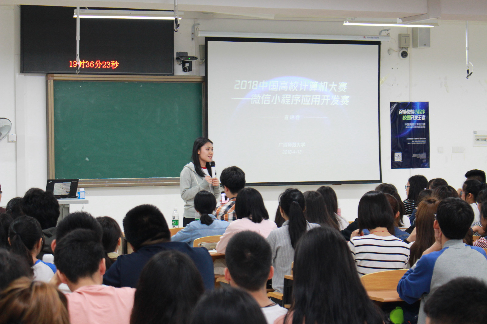 中国高校计算机大赛—首届大学生微信小程序应用开发赛是由教育部高等学校计算机类专业教学指导委员会、教育部高等学校软件工程教学指导委员会、教育部高等学校计算机课程教学指导委员会、全国高等学校计算机教育研究会和腾讯公司微信事业群联合主办,由清华大学承办,基于腾讯微信小程序平台的创新应用开发设计竞赛。为推进活动进展,鼓励更多的大学生参与进来,腾讯公司微信事业群与计信学院于4月12日晚上联合举办了一场生动的赛事宣讲会。学院党委学生工作负责人、李智老师和相关专业辅导员参加了会议。