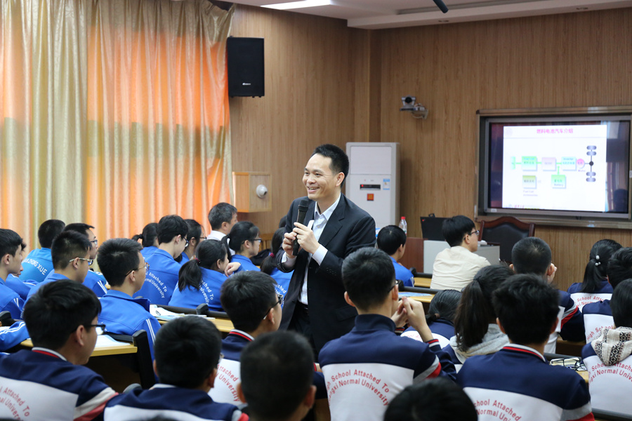 李教授从新能源汽车发展的必要性,新能源汽车的发展现状,以及新能源汽车的汽车的未来等几个方面向我校学生进行了介绍。当介绍到我国新能源汽车发展取得的巨大成就时,李教授的喜悦之情溢于言表,下面的听众也感到非常兴奋,并对李教授及其团队的追求卓越的精神和清华人肩负祖国繁荣复兴的使命感以及取得的杰出成果表示由衷地敬佩。讲座结束后是学生提问环节,李教授对学生的问题进行了一一解答,并对我校附属中学学生的善于发现问题和善于思考的能力表示赞赏。