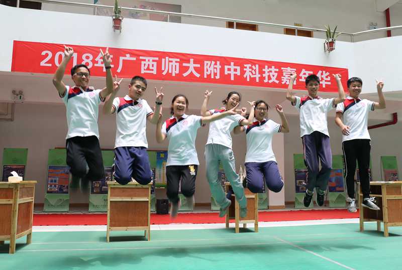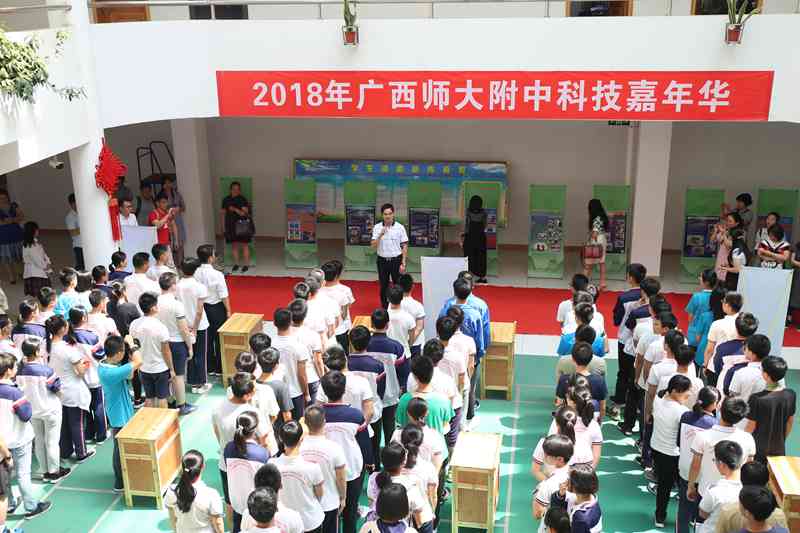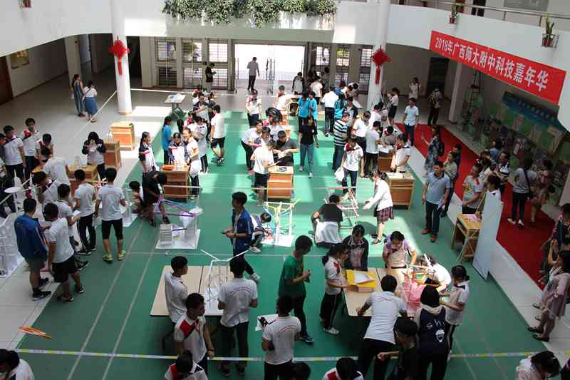 之后所有参会人员来到广西师大附中“科技嘉年华”会场,观摩了学校的科技运动会开幕式活动和学生开展的各项科技运动会项目,同时参观广西师大附中“科技创新成果展示”,接着全体人员来到师大附中图书馆参观了学校的“科研成果展”活动。