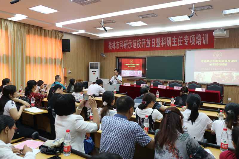 5月24日,桂林市科研示范校开放日暨科研主任专项培训活动在广西师范大学附属中学举行。在桂林市教科所科研规划办的组织下,桂林市各城区中小学幼儿园、桂林市及十二县中小学和科研示范学校的科研主任参加了此次活动。广西师范大学相关教授参加会议。