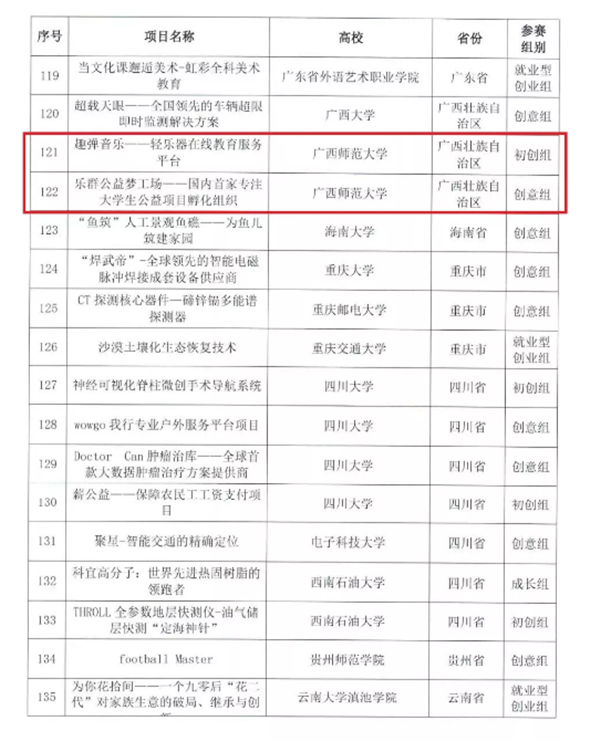 我校入围项目为分别是音乐学院2016届校友帅圳兴担任项目负责人的“趣弹音乐——轻乐器在线教育服务平台”(主赛道初创组),由创新创业学院、校教育发展基金会、校团委联合打造,生命科学学院2017级研究生赵剑光担任项目负责人的“乐群公益梦工场——国内首家专注大学生公益项目孵化组织”(主赛道创意组)。