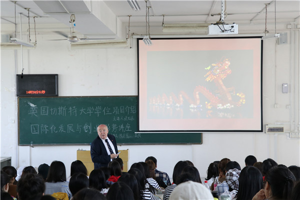 座谈会上,主持人首先代表学校对外宾的到来表示热烈的欢迎,并介绍了两校近2年的合作交流情况。Phil Harris教授充分肯定了两校开展的合作项目后,简要介绍了切斯特大学以及所在城市切斯特市的基本情况,并特别强调:建于1839年的切斯特大学在建校初期也是一所以培养教师为主的学校,现已发展成为一所极具创新精神的综合性大学,学校所在城市切斯特市也是英国著名的旅游城市(英国八大遗产文化之一)。这与广西师范大学的办学情况非常相似,更有利于增进相互间的了解,也为合作提供了有更多的可能性,进而促进双方携手为全球国际化贡献一份力量。随后,与会双方就各专业领域的学生短期交流、联合培养、学位项目、MBA合作培养,教师访学、执教等项目进行了热烈深入的交谈,并达成了初步的合作意向。最后,副校长苏桂发为Phil Harris教授颁发客座教授的聘书,并做总结发言。他表示:过去的两年,两校开展了很多实质性的合作项目,师生交流频繁,合作成果显著,希望将来能继续深化、拓展合作,期待双方碰撞出更多璀璨的合作火花。座谈会结束后,Phil Harris教授一行还专程前往雁山,开展了《国际化发展与创业形式》主题讲座和切斯特大学学生学位项目宣讲会,我校近300名师生参加。