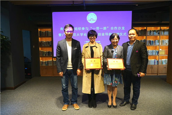 为贯彻落实“一带一路”战略,着力培育具备参与对外交往和国际事务能力的青年社会组织,11月8日,由我校创新创业学院、教育发展基金会、团委及中国-东盟青年社会组织发展研究院,联合举办的青年社会组织参与“一带一路”合作沙龙暨广西师范大学社会公益创业导师受聘仪式,在校育才校区独秀书房举行。
