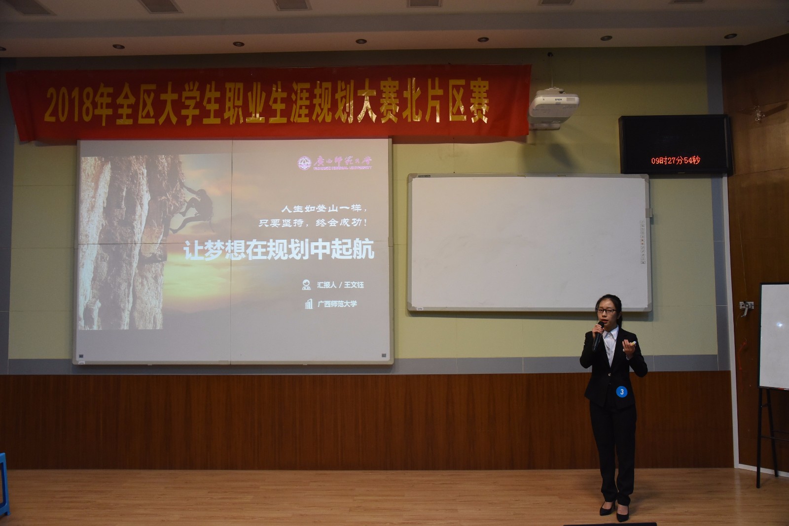 为进一步强化就业指导服务,引导大学生树立正确的成才观、择业观和就业观,提升学生的学业生涯和职业规划能力,12月1日至2日,由广西毕业生就业促进会主办,广西师范大学承办的“2018年全区大学生职业生涯规划大赛北片区赛”在我校育才校区理科楼001教室成功举行。