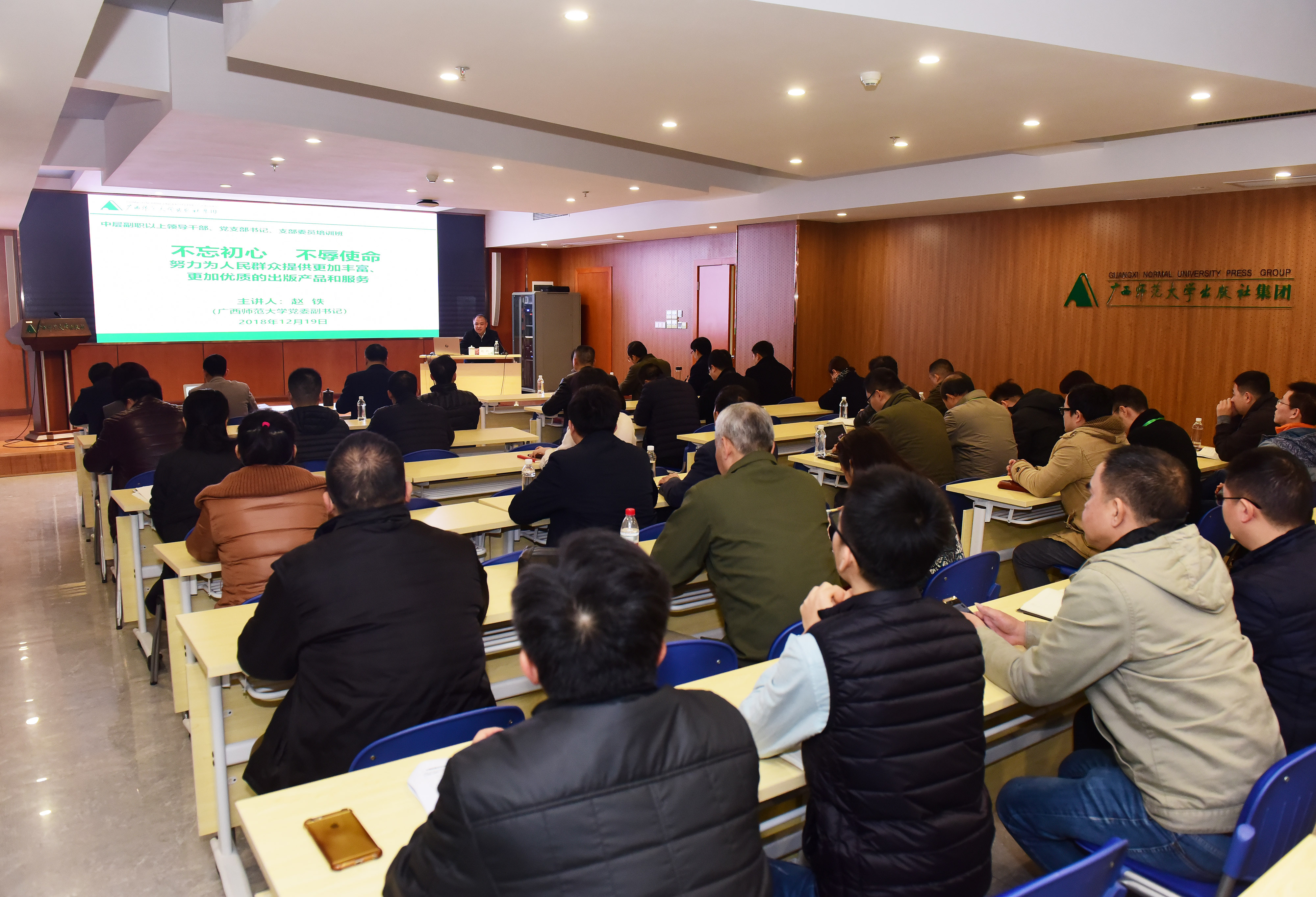 12月19日上午,校党委副书记赵铁在出版社集团总部大楼为出版社集团中层副职以上领导干部、党支部书记及党支部委员上了题为《不忘初心,不辱使命,努力为人民群众提供更加丰富、更加优质的出版产品和服务》的党课。