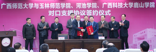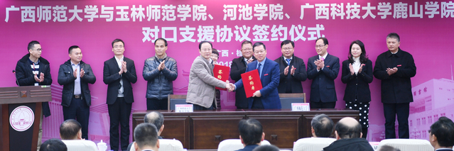 12月27日上午,我校在育才校区图书馆一楼报告厅分别与玉林师范学院、河池学院、广西科技大学鹿山学院签订2018—2022年对口支援协议,并开展相关对口交流活动。校领导邓军、贺祖斌、旷永青、赵铁、苏桂发、莫坷、林春逸、李英利,校党委常委黄轩庄、林国庆、黄海波;玉林师范学院全体校领导唐仁郭、王卓华、韦广雄、李伟中、黄映然、赵峰、韦宏明,河池学院党委书记韦安光、校长郎耀秀,广西科技大学副校长、鹿山学院院长李利军、常务副院长魏锋、书记庞晓红出席签约仪式,我校各学院(部)、各单位主要负责人,三所来访高校的职能部门和教学单位代表近100人见证签约仪式。签约仪式由副校长苏桂发主持。