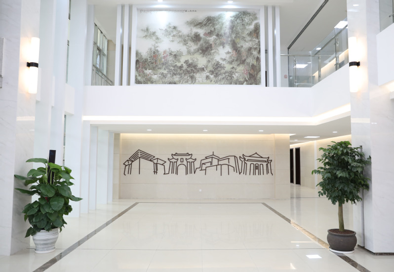 新行政中心大厅东侧上方为《秋染雁山园》图;下方为我校雁山校区图书馆、王城校区大门、育才校区图书馆、王城校区国学堂建筑剪影
