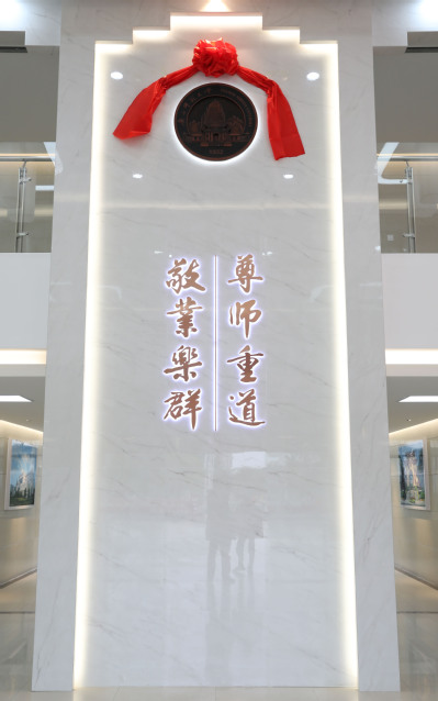 新行政中心大厅西侧上方为电子显示屏;下方为中国高等教育界泰斗潘懋元教授为我校题词
