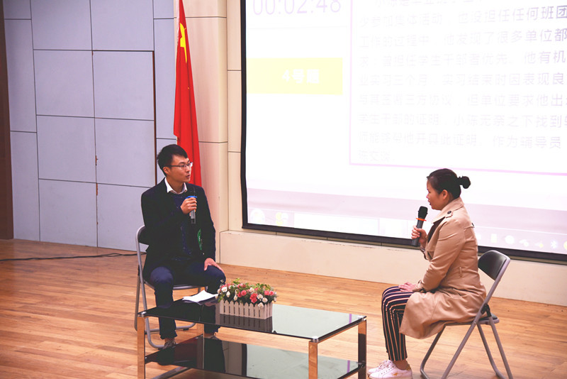 谈心谈话环节中,辅导员们围绕“心理疏导”“纪律管理”“奖助评定”“爱国教育”和“就业指导”等主题展开情景模拟,灵活运用心理学、教育学、职业发展教育、思想政治教育等相关理论并结合自身工作经验与学生一对一谈话,将教育、管理、服务有机结合,用心帮助学生分析面临的问题,探讨解决问题的办法,展示了较强的教育引导能力和问题解决能力。