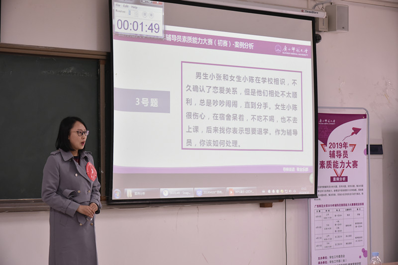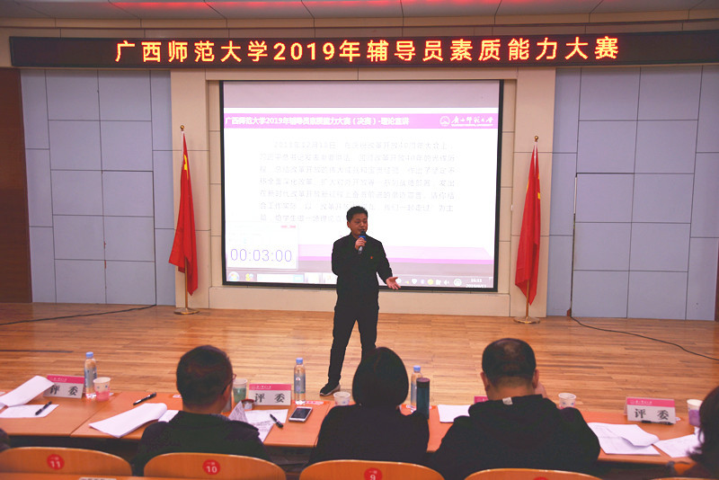 4月11日,我校2019年辅导员素质能力大赛决赛在雁山校区大学生学术报告厅举行。本次比赛由校学生工作委员会主办,学生工作部(处)承办,职业技术师范学院协办。来自桂林片区高校的学工部(处)、团委负责人及我校相关部门负责人共11人担任了此次大赛评委。校党委、校行政十分重视本次比赛,校党委副书记旷永青多次对比赛提出具体要求,并到比赛现场检查相关工作。