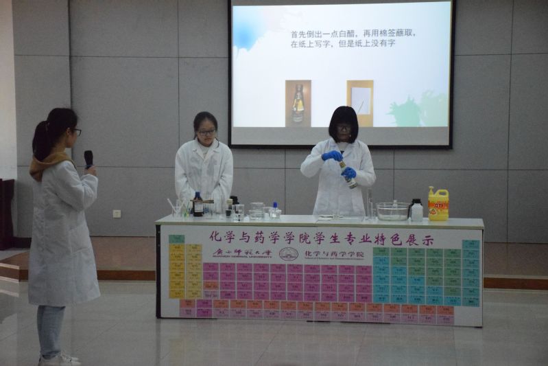 会上,化学与药学学院负责人作了《学院学风建设与教育教学改革成果》报告。她指出,化药学院始终秉持“以学生为中心”理念,探索领导挂联班级、高端班主任制度,贯彻落实“三全育人”,将思想政治教育贯穿于育人过程,取得良好效果。随后,化药学院向到场老师展示学院学生工作特色视频,化药学院同学还通过“秘密信件”“液体里的星光”“点不着的布”“大象牙膏”等趣味实验展示了专业特色学习成果。