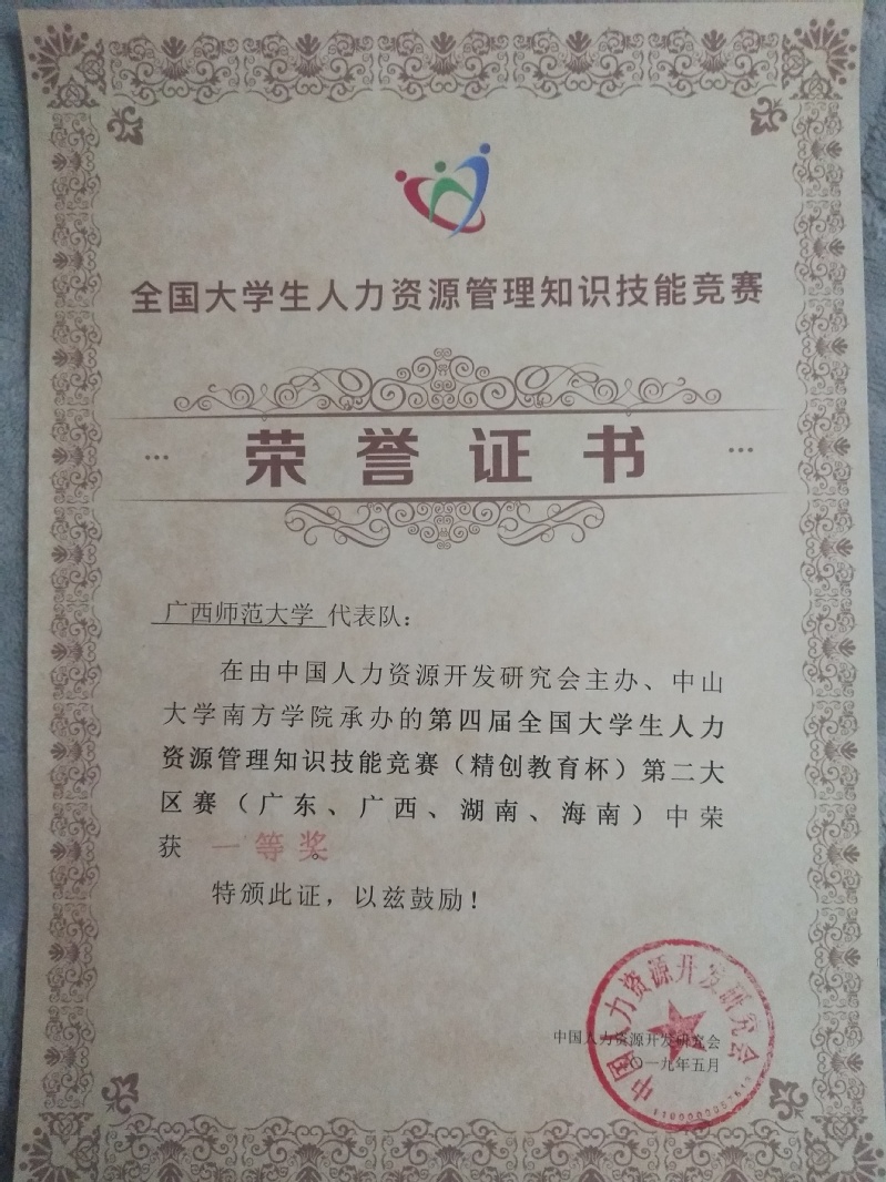 5月18日,经济管理学院2017级人力资源管理班的蓝震武、陈志鹏、马晓君、邓标四名同学在秀英老师和吴朝晖老师的带领下,赴广州参加由中山大学南方学院举办的第四届全国大学生人力资源管理知识技能竞赛(精创教育杯),在比赛的这短短几天里,他们凭借个人优秀执行力及过人的专业知识、团队组织明确的分工协作和高度的凝聚力,在此次比赛中斩获第四届全国大学生人力资源管理知识技能竞赛(精创教育杯)第二赛区的一等奖。