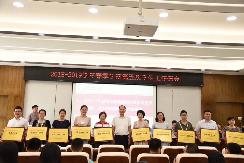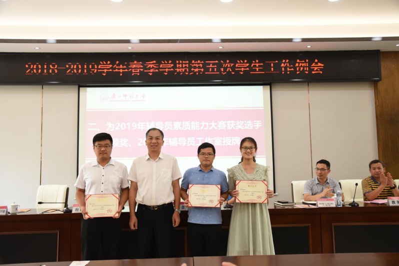 会上,校团委负责人宣读了我校2019年辅导员工作室重点培育项目名单和2019年辅导员素质能力大赛表彰文件,校党委副书记旷永青、参加会议的职能部门负责人分别为辅导员工作室授牌和素质能力大赛获奖选手颁奖。人事处、保卫处、校团委等负责人分别就职称评审和岗位聘用、校园禁摩与安全保卫、暑期社会实践等工作进行了通报和说明。学工部(处)主要负责人就近期安全稳定、毕业生就业帮扶、奖助学金评定和辅导员队伍建设等工作进行了布置和说明。