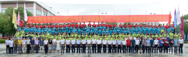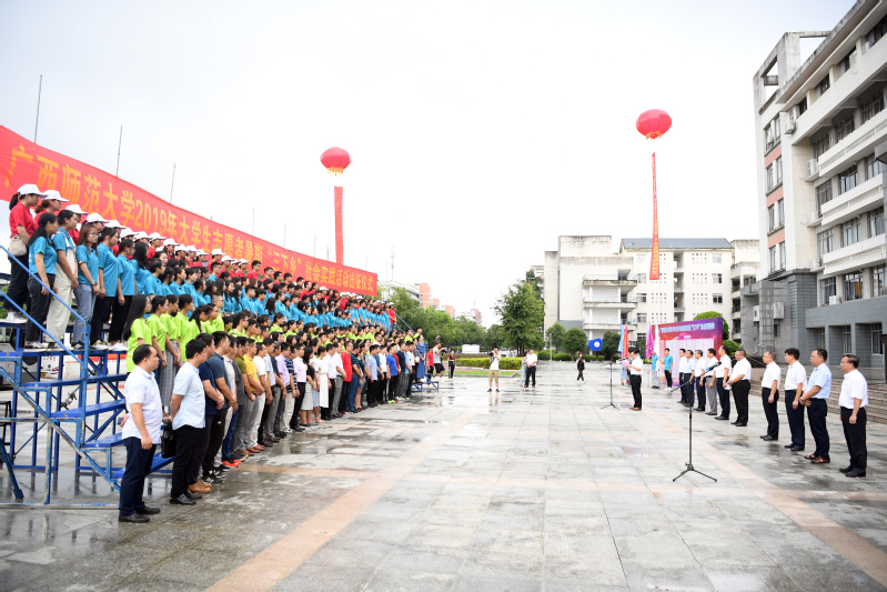7月6日上午,我校在雁山校区起文楼北楼广场前举行2019年大学生志愿者暑期“三下乡”社会实践活动出征仪式。校领导邓军、贺祖斌、旷永青、赵铁、黄文韬、苏桂发、莫坷、林春逸,校党委常委黄轩庄、林国庆、黄海波出席出征仪式。参加仪式的还有党办、校办、学工部(处)、校团委、研究生院、教务处等职能部门相关负责人,各学院(部)分管学生工作党委副书记、团委书记,学校第十二期“青马”学员以及各实践项目、挂职团队指导老师和团队代表共300余人。校党委副书记旷永青主持出征仪式。