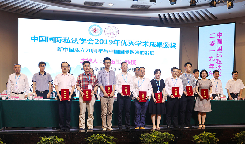 大会还对中国国际私法学会年会优秀学术成果进行了表彰。本次年会评选出12项优秀学术成果,其中一等奖3项、二等奖9项。中国国际私法学会副会长兼秘书长郭玉军教授宣读了获奖名单,主席台嘉宾为获奖者颁发获奖证书。