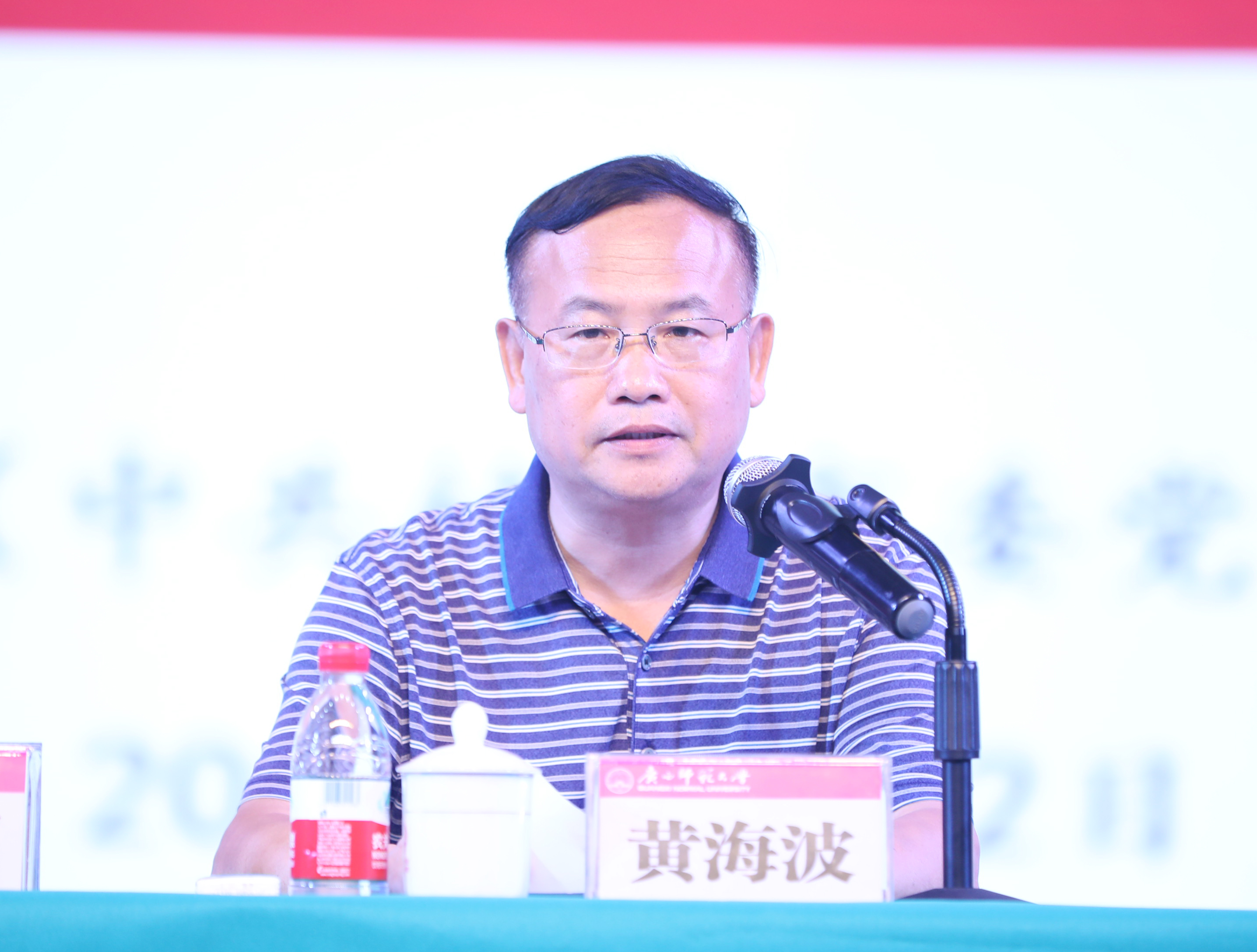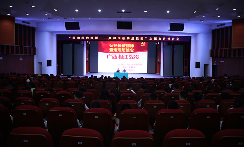 在中华人民共和国成立70周年之际,为进一步激发青年学生的爱国之情、强化青年学生的爱国之志,自治区党委宣传部、自治区党委党史研究室、自治区党委教育工委联合开展“我和我的祖国——共和国故事进校园”百场主题宣讲活动。按照上级部署,9月12日上午,我校在雁山校区音乐学院三楼综合厅举行了“我和我的祖国——共和国故事进校园”主题宣讲报告会,邀请桂林市委党史研究室副主任彭敏翎作题为《弘扬长征精神 坚定理想信念:广西湘江战役》的报告。校党委宣传部、统战部、学工部(处)、校团委等部门负责人,以及辅导员代表、学生代表共480多人现场聆听专家的精彩报告。校党委常委、统战部长黄海波主持报告会。