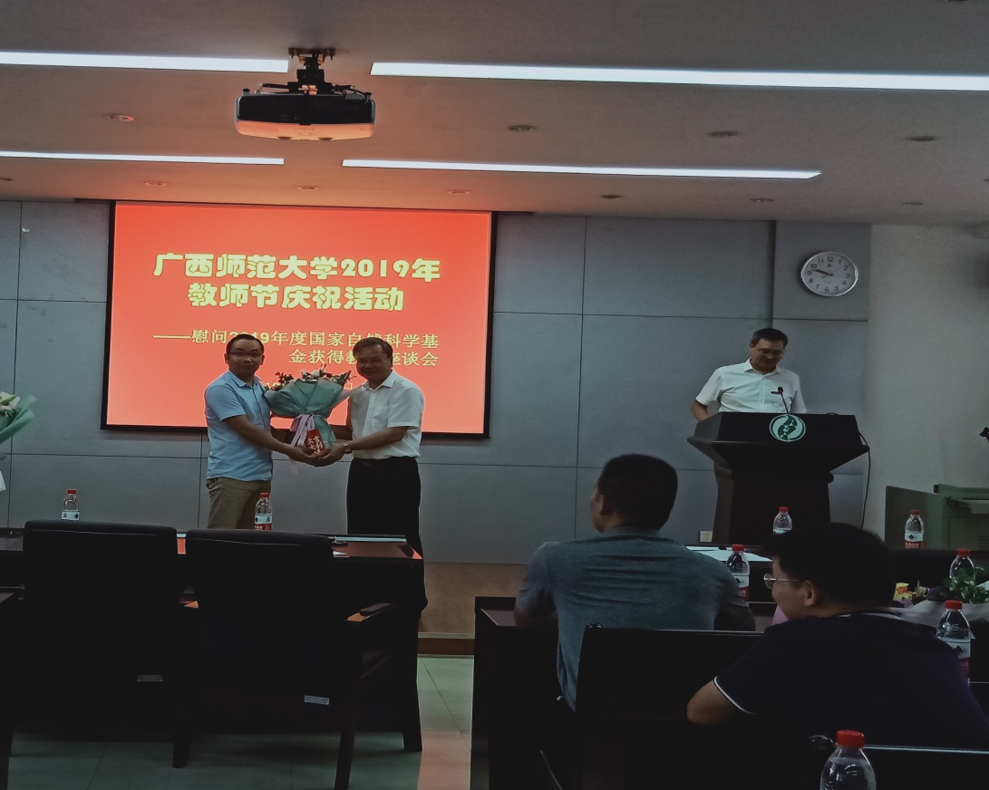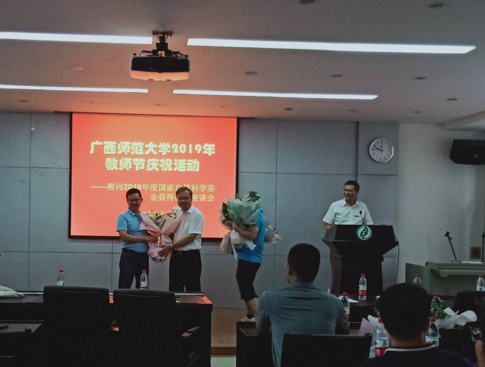 为深入贯彻落实习近平总书记关于教育的重要论述和全国、全区教育大会精神,热烈庆祝第35个教师节,营造浓厚的节日氛围,为我校科技工作者营造节日温暖。学校于9月10日上午,在国家重点实验室310报告厅举行了“2019年度获得国家自然科学基金教师慰问座谈会”,苏桂发副校长、科技处负责人、立项教师出席了座谈会。
