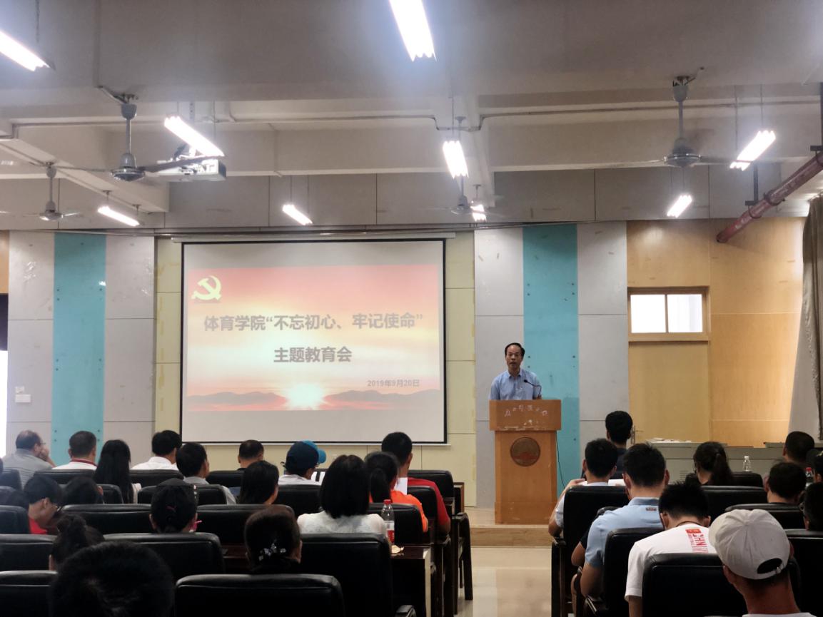 9月19日下午,体育学院在雁山体育楼503会议室召开“不忘初心,牢记使命”主题教育工作会议。校党委常委、副校长黄文韬,校党委常委黄海波,院领导班子全体成员,院全体教师和学生党员参加会议。