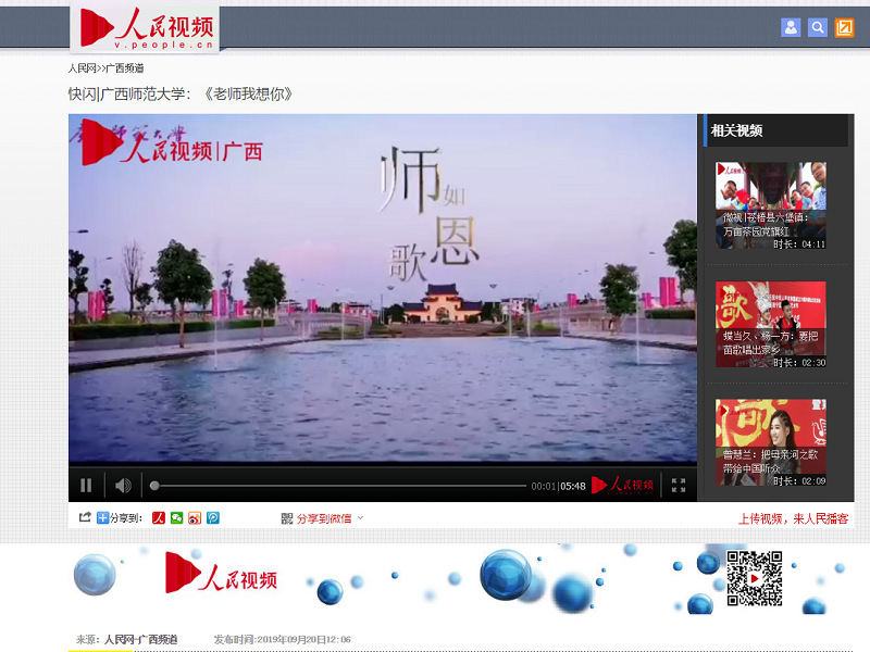 为庆祝新中国七十华诞,弘扬尊师重教的社会风尚,9月10日,在第35个教师节来临之际,我校精心拍摄的主题MV《师恩如歌》首发,通过学子唱响温情旋律,展现我校教师倾心育人、潜心科研的风采。为广大教师和教育工作者送上教师节最真挚的祝福!一经首发,备受关注,好评如潮,多次获主流媒体转发。“共青团中央”官方微博、“中华全国学联”官方微博、八桂教育自治区教育厅官方微信、“广西共青团”官方微博、“广西学联”官方微博等校外媒体第一时间转发。9月20日,人民网转发报道我校教师节主题MV《师恩如歌》。