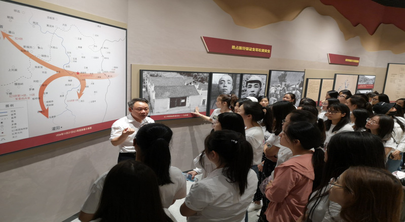 从红军烈士纪念碑和酒海井遗址出来,大家又来到新圩狙击战史实陈列馆。灌阳县党校教师为大家详细讲解湘江战役第一战——新圩狙击战的历史背景、原因和重要意义,师生们为其中的长征故事和长征精神震撼不已。尤其是34师师长陈树湘同志断肠明志,以如此壮烈的方式实践自己的诺言“为苏维埃流尽最后一滴血”,让师生们再次落下泪来。