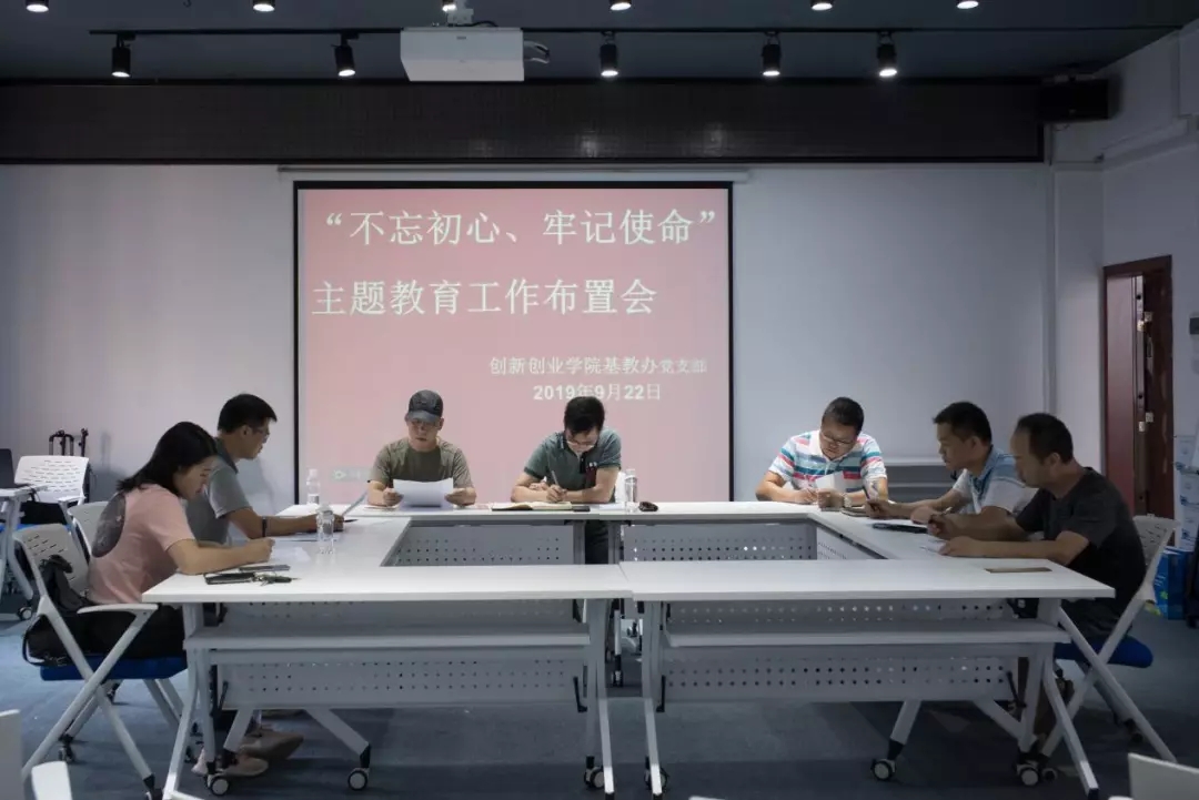 按照学校党委“不忘初心、牢记使命”主题教育工作部署的安排,9月22日下午,为压紧压实基层党组织履行党建主体责任,加强对支部党员主题教育的领导和指导,创新创业学院基教办党支部“不忘初心、牢记使命”主题教育活动工作布置会在理二楼209会议室召开,支部全体党员参加了会议。